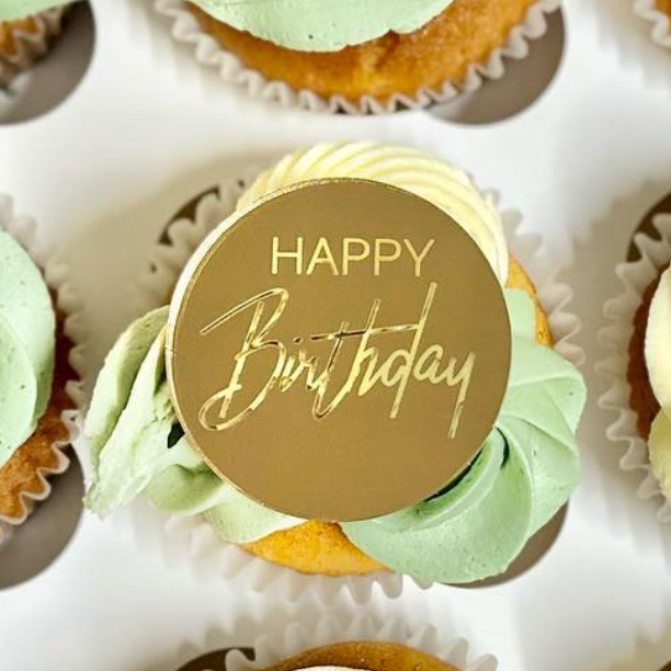 Round Acrylic Cupcake Topper Disc - Happy Birthday Script 6pc