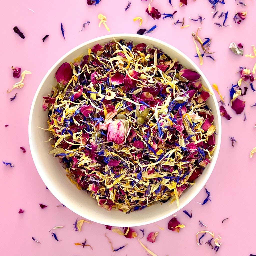 Floral Cascade is a rich and elegant blend of edible dried flowers, featuring blue cornflower, red rose petals, rose buds, calendula, and rosella.