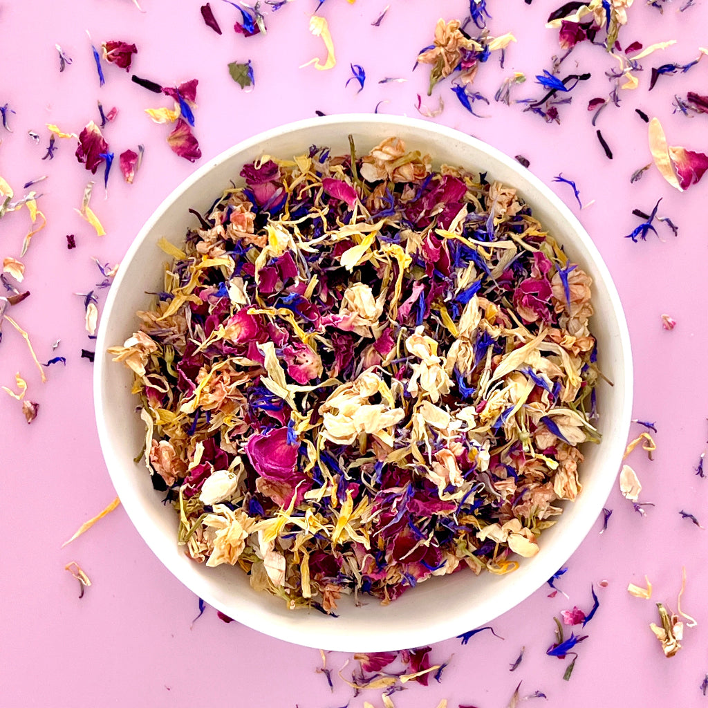 Mystic Garden is a dreamy blend of edible dried flowers, combining jasmine, red rose petals, blue cornflower, calendula, and rosella.