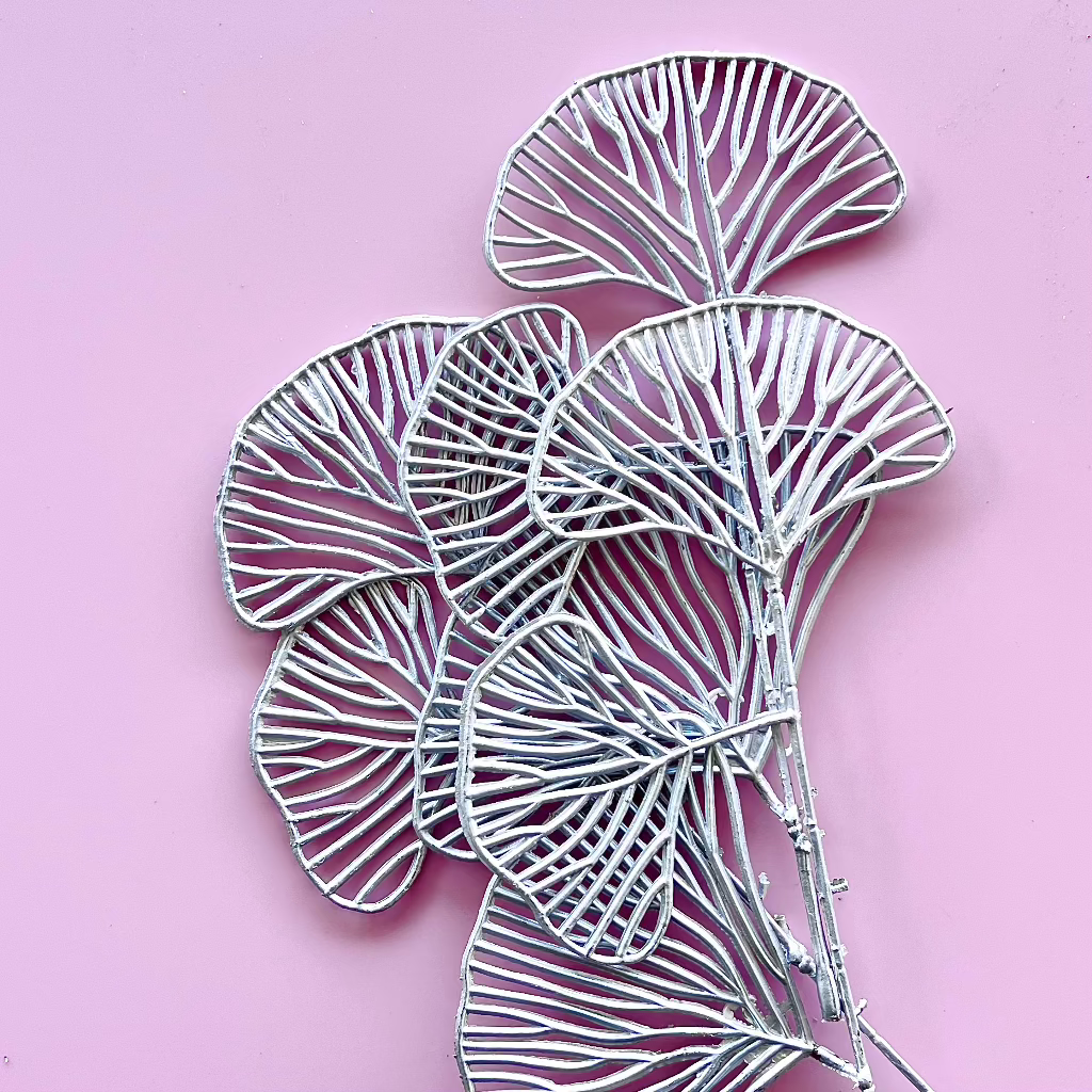 These artificial silver ginkgo leaves are perfect to use as a cake or cupcake toppers.