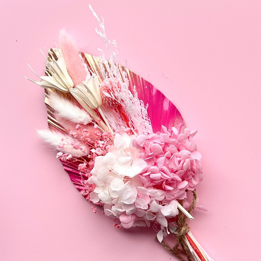 Colour: Gold and pink spear palm with glitter edge, white and pink preserved flowers.