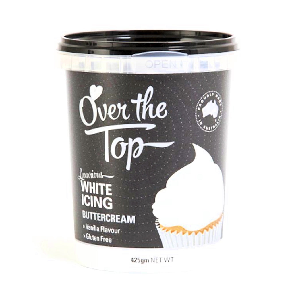 This fantastic Over the Top buttercream is a ready to use yummy and fluffy buttercream icing. Over The Top Buttercream is great for icing and decorating. Over the Top buttercream is smooth and silky with superior piping consistency. It is perfect for filling cakes, piping on cupcakes and more. Over the Top buttercream is Australian made and it's gluten free, nut free, egg free and dairy free, making it suitable for vegans.