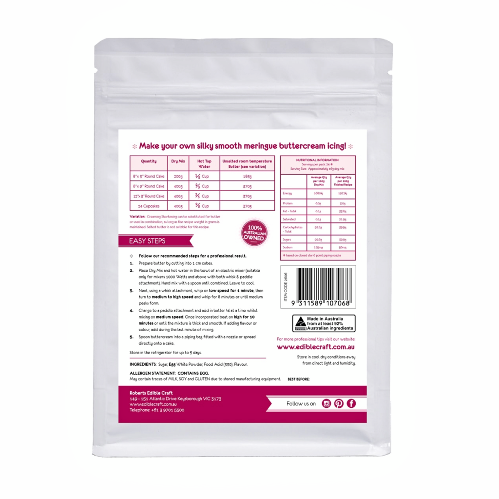 Roberts Edible Craft silky icing meringue buttercream mix has been developed and manufactured in Australia.