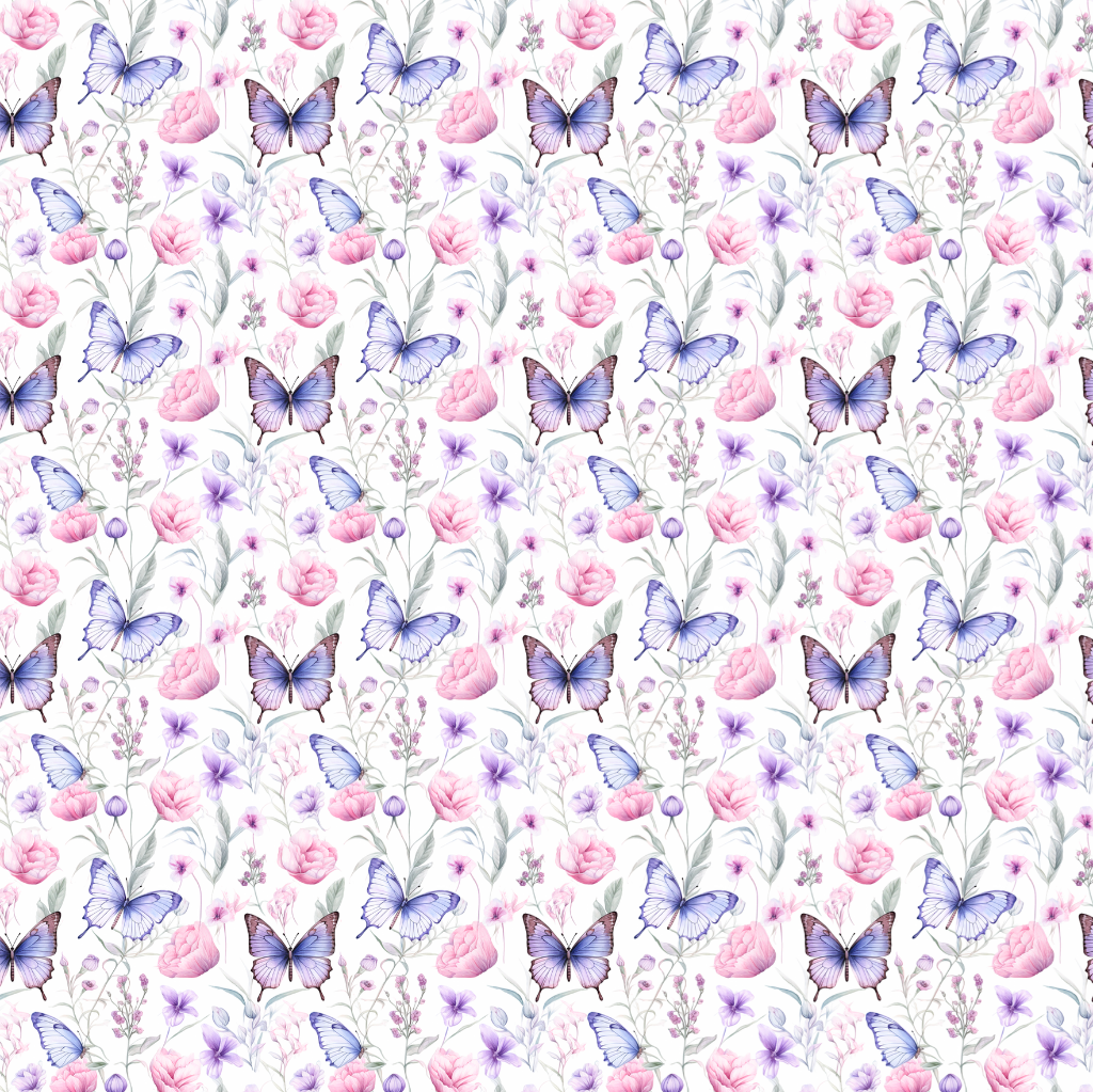 Soft, feminine, and fairytale pretty our Flutter and Bloom custom greaseproof paper features lilac butterflies with pastel pink flowers.