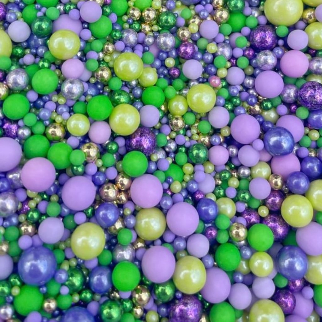 This edible sprinkle mix is packed with vibrant green, purple, lilac, and shimmering silver sprinkles in mixed sizes.