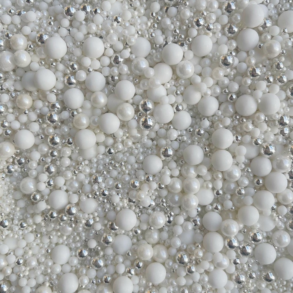 Frost Bite is perfect sprinkle mix for weddings and bridal showers featuring white and silver sprinkles in mixed sizes.