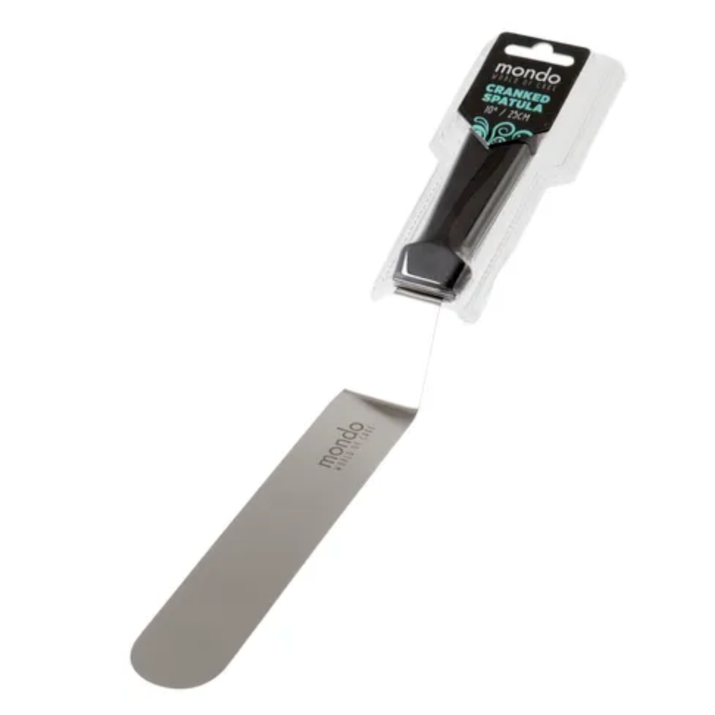 Professional quality 8" stainless steel cranked spatula from Mondo. Perfect cake decorating tool for any home or professional cake decorator. Cranked spatula is also known as an angled spatula or offset pallette knife.