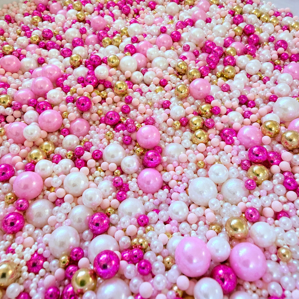 A dazzling sprinkle blend of various shades of pink, pearl white, and metallic gold and hot pink.