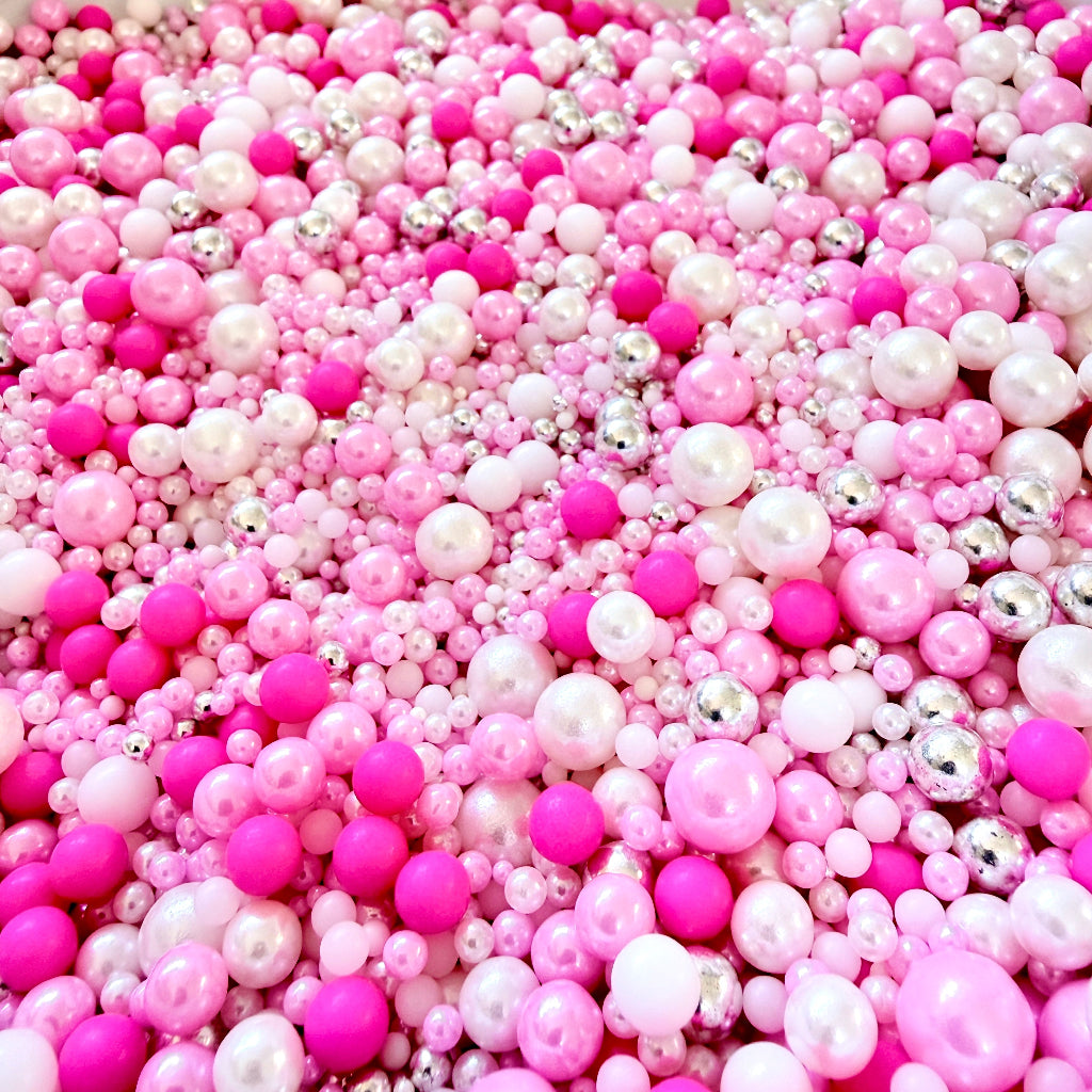 A dazzling sprinkle blend of various shades of pink, pearl white, and metallic silver.