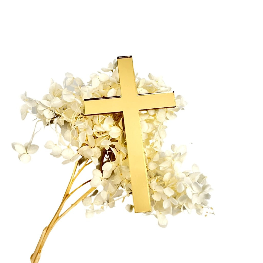 This elegant cross cake topper is made out of high quality gold acrylic.