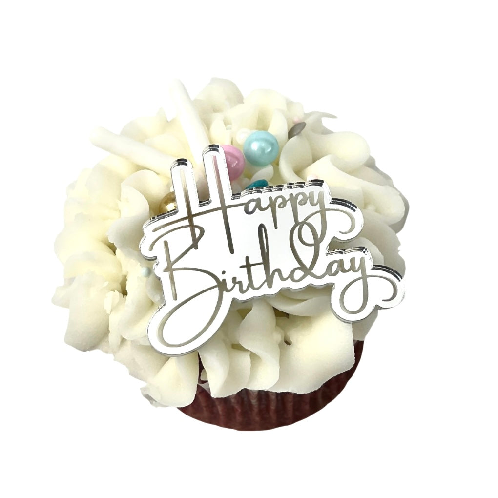 Acrylic Cupcake Topper Charms - Silver Happy Birthday 6pc