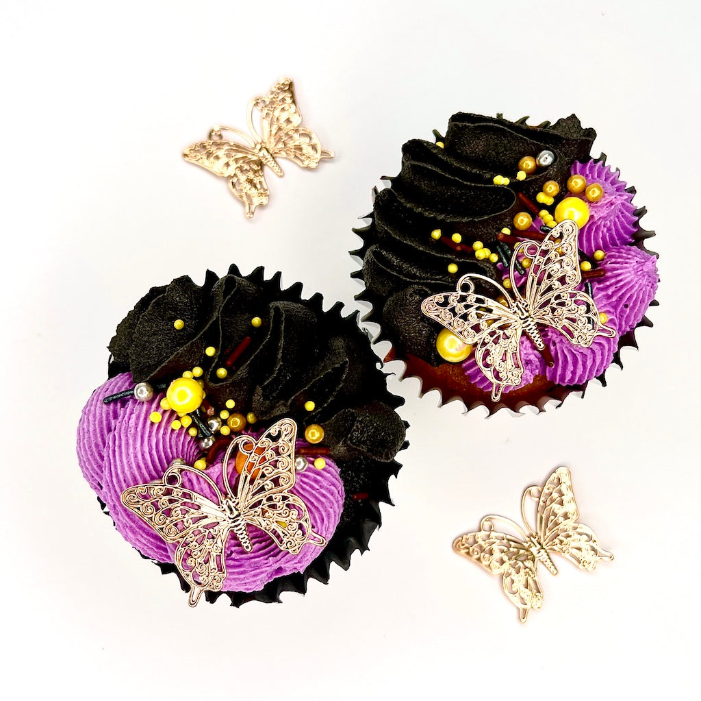 These metal butterflies are gorgeous to decorate cupcakes with, on cakes or use hot glue to secure them to food safe wires to insert into cakes or cupcakes as flying butterflies.
