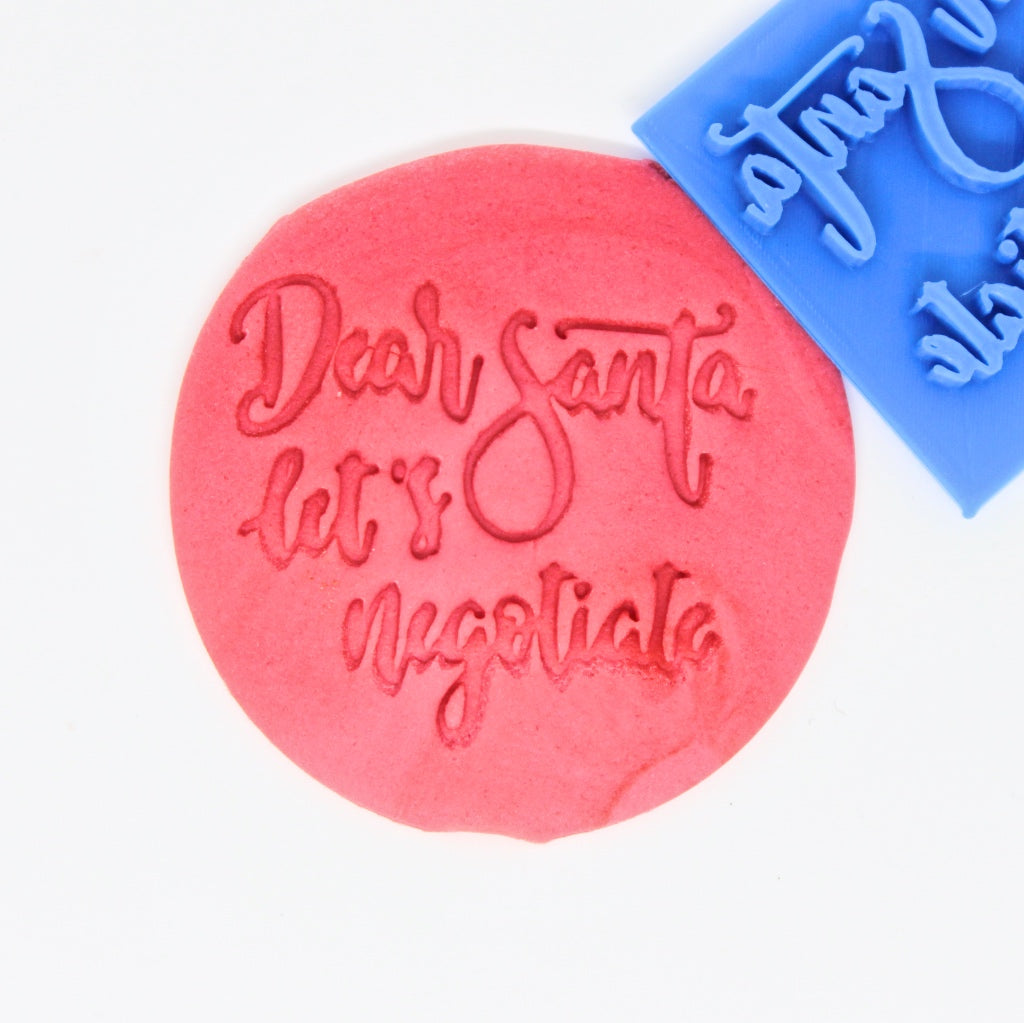 This Dear Santa Let's Negotiate cookie fondant embosser is great for creating detailed edible decorations for the Christmas cakes, cookies or cupcakes. Our cookie embossers can be used with gum paste, sugar paste, fondant, modelling paste and more. Make your decorations extra special, and use some lustre dusts to make it sparkle.