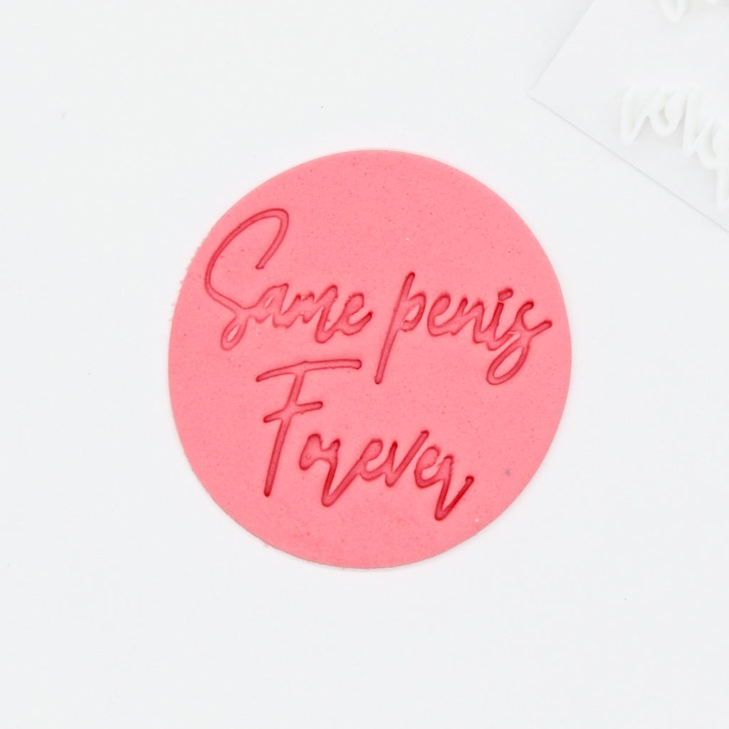 This "Same Penis Forever" cookie fondant embosser is great for creating detailed edible decorations for the hens night cookies or cupcakes. Fondant embossers can be used with gum paste, sugar paste, fondant, modelling paste and more.