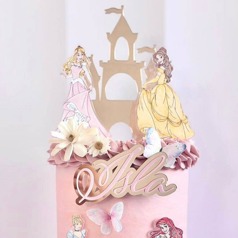 A perfect way to add unique touch to your princess themed birthday cake with these double layer custom name cake fropper and castle cake topper.