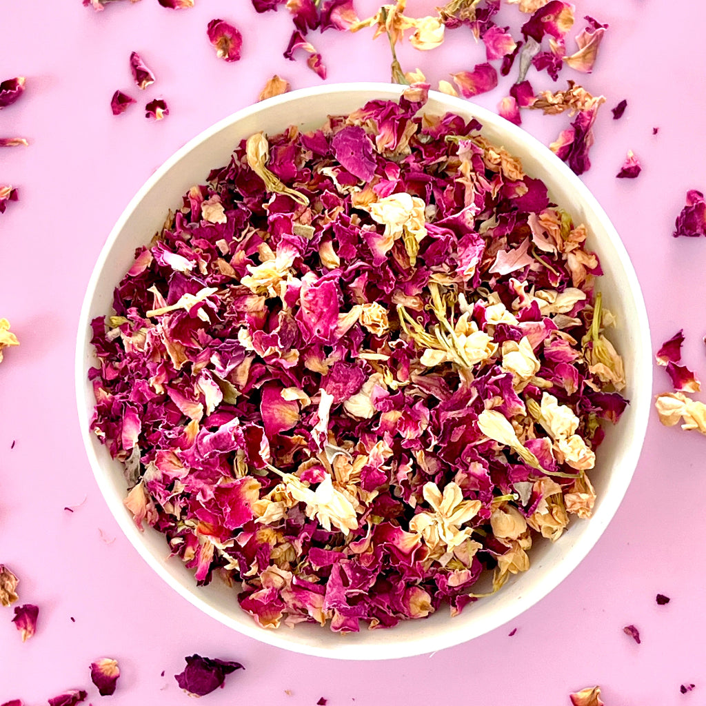 Create a captivating look with Midnight Bloom, a stunning blend of dried edible flowers featuring red rose petals and jasmine.