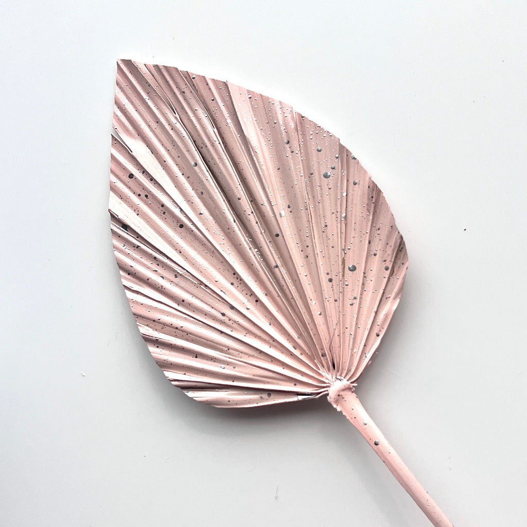 Colour: Pink spear palm with silver paint splatter, pink and white flowers.