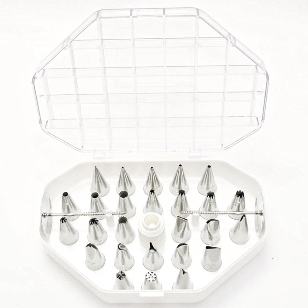 Includes: Round piping nozzles - 1, 2, 3, 4, 5, 8, 10, 12. Star piping tips - 16, 18, 20, 21. Closed star piping tips - 27, 30. Open star piping tip - 32. Basketweave - 47. Petal - 61. Leaf - 67, 70, 352. Specialty - 80, 98 Rose - 104. Drop flower - 106. Multi opening - 233. Standard coupler x 1. Flower nails x 2. Storage case x 1