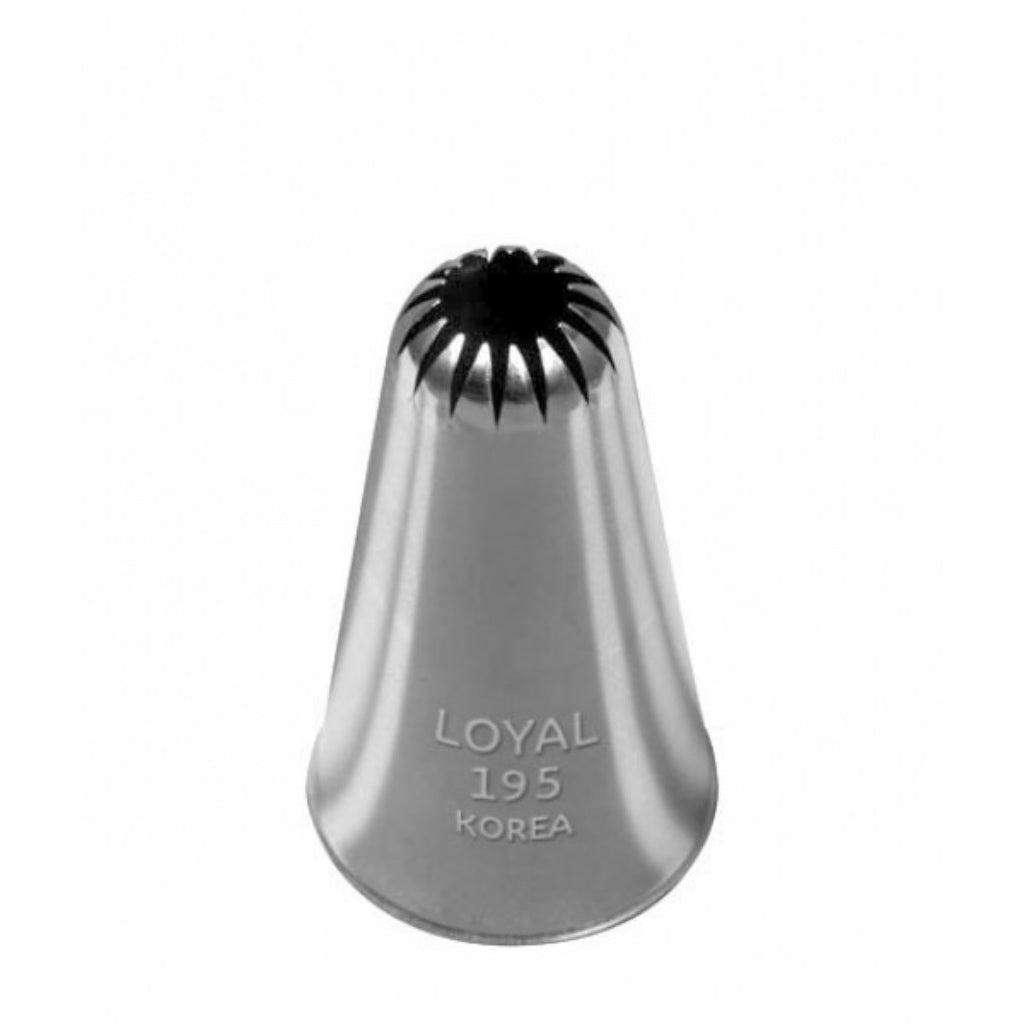 Quality piping nozzles from Loyal are the preferred choice for cake decorators. All Loyal piping tips are seamless. This no.195 drop flower piping tip is ideal for piping 'one squeeze' drop flowers and rosettes. Loyal piping nozzles are professional grade.