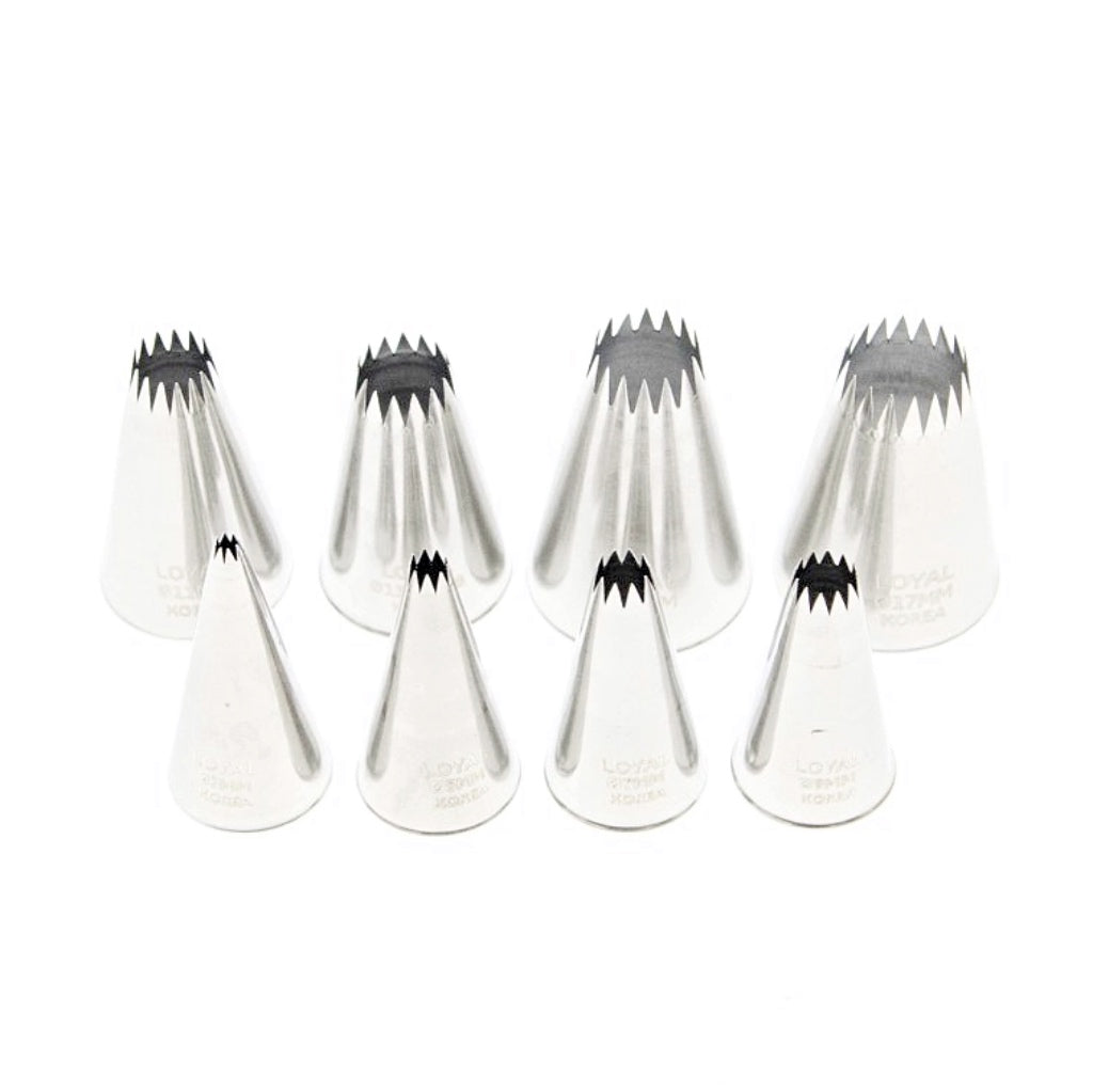 This is a professional grade 8 piece stainless steel star pastry tube set from Loyal, that will last you a lifetime. All Loyal piping nozzles are seamless.