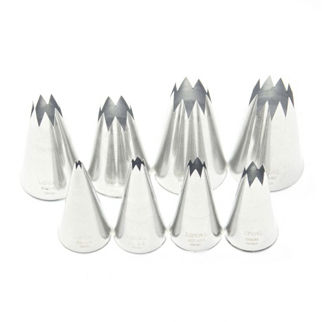 This is a professional grade 8 piece stainless steel star pastry tube set from Loyal, that will last you a lifetime. All Loyal piping nozzles are seamless.