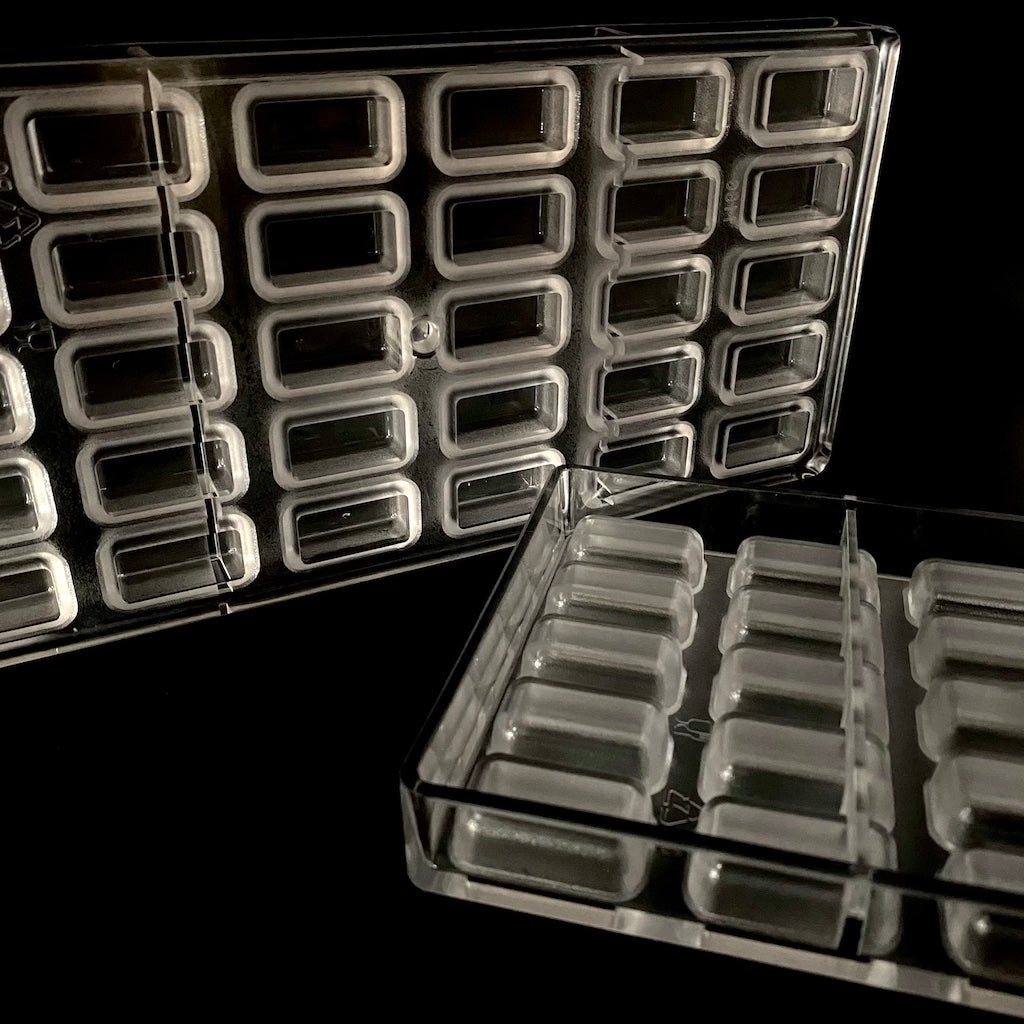 Size: whole mould 27.5cm x 13.5cm x 2.4cm, size of each cavity 3cm x 1.5cm x 1.1cm