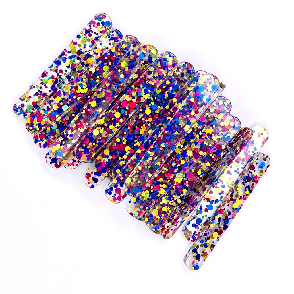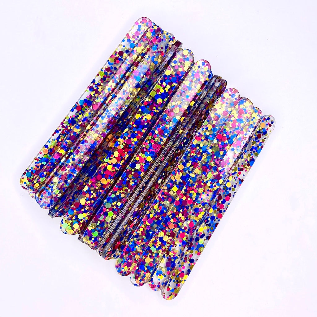 Forget the boring wooden ice cream sticks. These Chunky Glitter acrylic reusable cake popsicle or ice cream sticks, are perfect for your next edible creations.