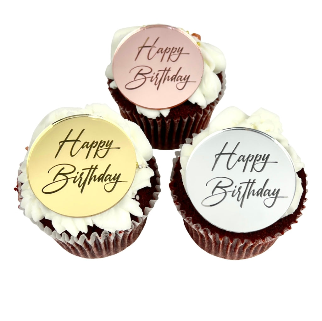 Round Acrylic Cupcake Topper Disc - Happy Birthday Handwritten 6pc