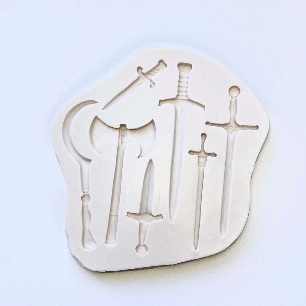 This vintage swords and axes mould is great for creating exciting and detailed edible decorations for your next cake, cupcakes, cookies, macarons and more. Silicone moulds can be used with gum paste, sugar paste, fondant, modelling paste, chocolate, clay, soap and more.