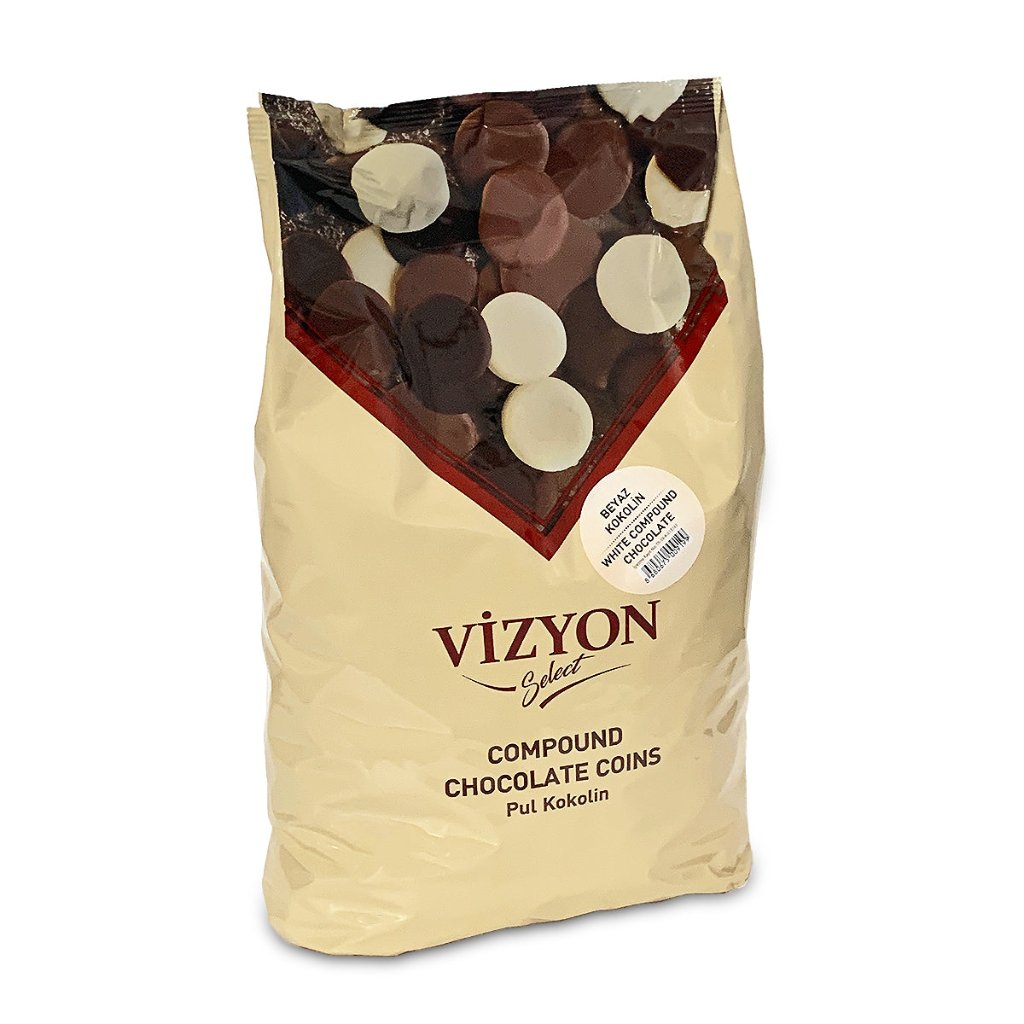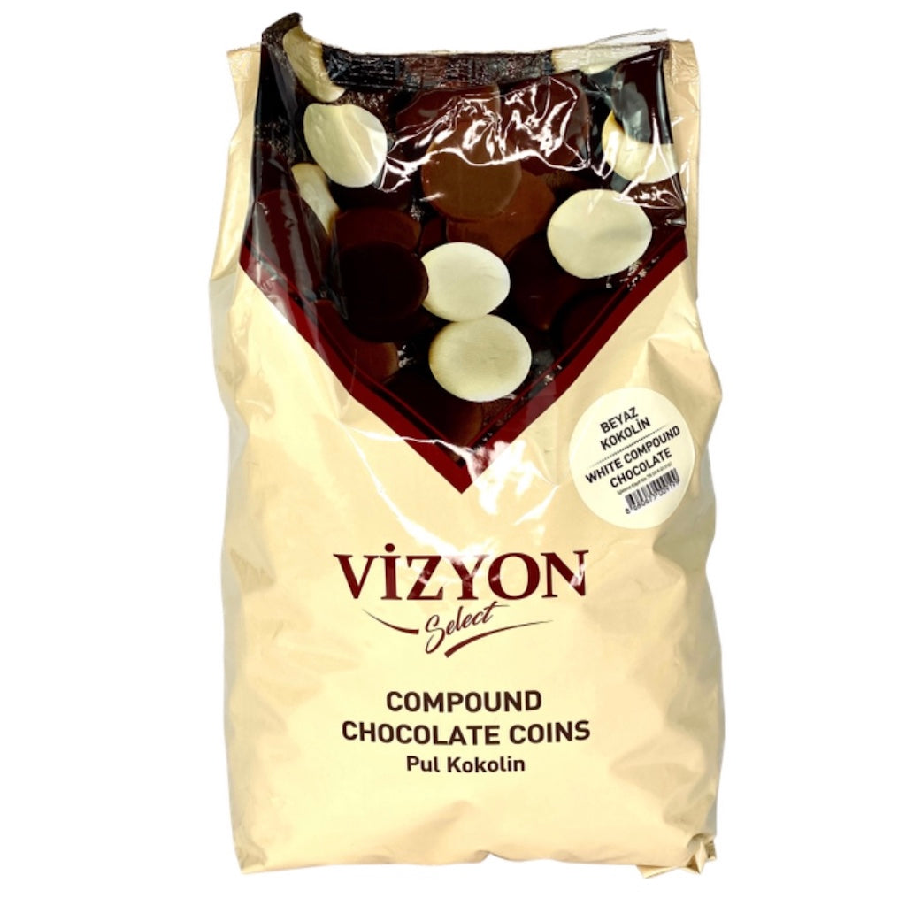 Vizyon Select white chocolate compound coins are a premium chocolate product available in a 2.5kg bulk pack or 500g bags.